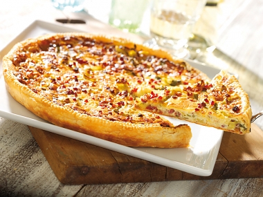 Schinkenwürfel mit Zwiebel und Öl kurz anbraten, Porree zugeben und alles andünsten, abkühlen lassen. Die Hälfte der Mischung auf den Boden der Tarteform verteilen.
