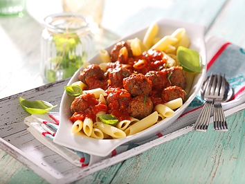 Penne nach Packungsanleitung 10-12 Minuten zubereiten, auf 4 Teller verteilen, mit Fleischbällchen und Sauce servieren und mit Basilikumblätter dekorieren.