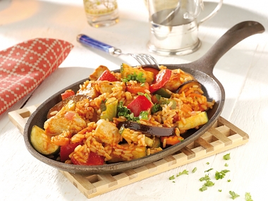 Knoblauch und Gewürze zugeben und bei kleiner Hitze ca. 15 Minuten garen. Tomaten enthäuten, in Stücke schneiden und mit dem Fleisch und der Petersilie zum Gemüse geben. Nochmals 10 Minuten garen, den fertigen Reis unterheben und durchziehen lassen.