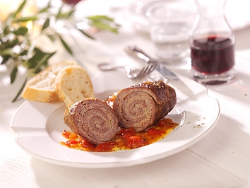 In einem Bräter mit Öl und Zwiebeln die Rouladen von allen Seiten braun anbraten. Die Tomatenwürfel zugeben, mit Wasser und Rotwein ablöschen und bei mittlerer Hitze ca. 60 Minuten schmoren lassen.