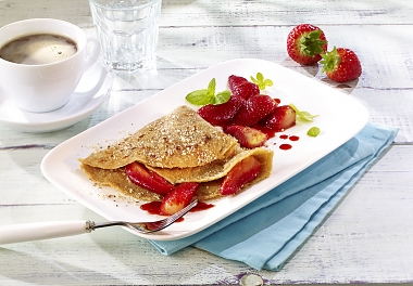 Die fertigen Pfannkuchen auf vier vorgewärmte Teller verteilen, mit gemahlenen Haselnüssen bestreuen, vorsichtig zu einen Viertel einschlagen und mit den Erdbeeren servieren und mit Minze dekorieren.